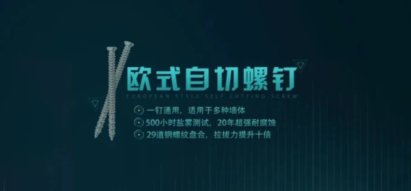 特質(zhì)合金鋼螺釘,一釘通用各種墻體,避免用釘錯誤,簡(jiǎn)化安裝步驟。常規用的固定螺絲有俗稱(chēng)小黃魚(yú)的膨脹螺釘、射釘、和拉爆螺絲,這三種固定原理是摩擦力或者膨脹力。不同螺釘適用于不同墻體,對安裝師傅是一大考驗,而特制加長(cháng)合金自切螺釘可通用各類(lèi)墻體。