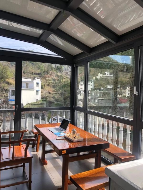 相較于市面大多數普鋁陽(yáng)光房,綠盾中天系統陽(yáng)光房型材均為斷橋結構,內外框軟性結合,使陽(yáng)光房更具保溫隔熱性,頂部選用遮陽(yáng)節能玻璃,立面采用光感遮陽(yáng)百葉玻璃。