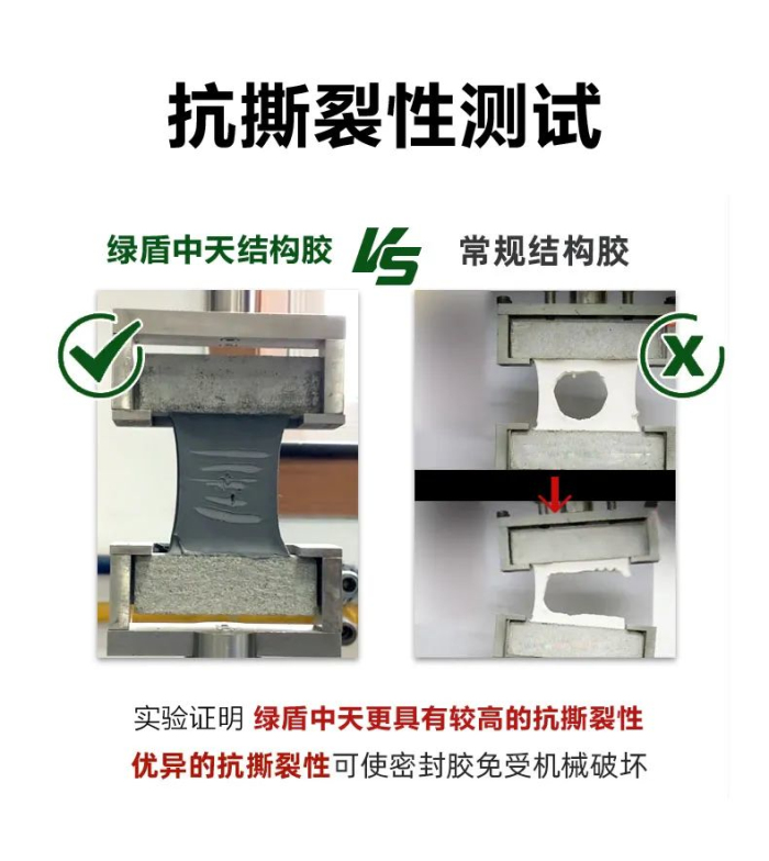 這款膠固化之后拉伸強度高,彈性更好,位移能力25%以上,滿(mǎn)足陽(yáng)光房建筑接縫處可能面臨的由外力引起的動(dòng)態(tài)位移的要求,除此之外這款膠具有更高的抗撕裂性,可使密封膠免受機械破壞。
