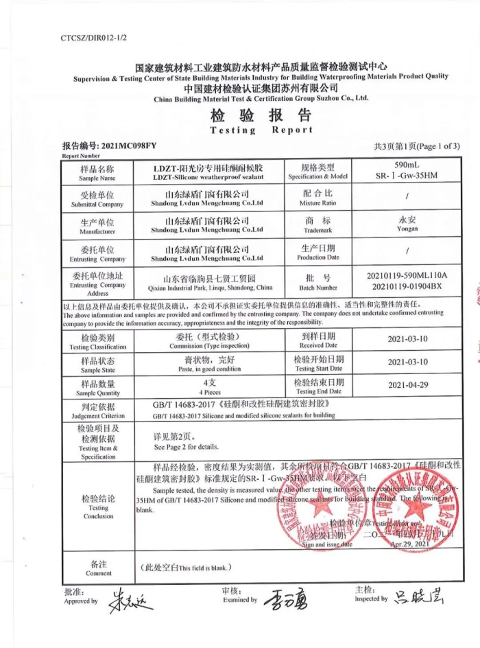 實(shí)踐是檢驗真理的標準,綠盾中天陽(yáng)光房工程硅酮耐候膠均經(jīng)過(guò)機構檢測認證,同時(shí)符合GB16776-2005的相關(guān)要求,使用更安心。