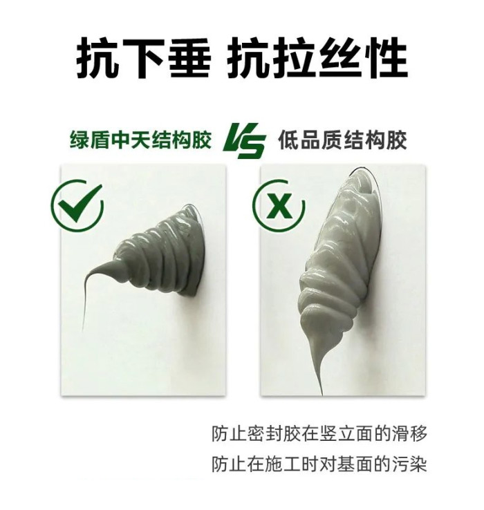 抗下垂性能可有效防止密封膠在豎立面的滑移,在豎立面作業(yè)時(shí)更方便,優(yōu)良的抗拉絲性能防止在施工時(shí)對基面的污染。